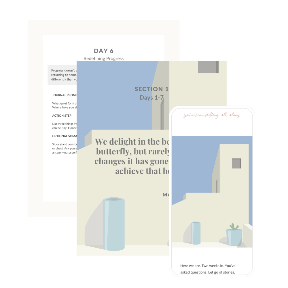 This is not a quick fix or a magic formula. It’s a steady rhythm you can step into: 14 days of daily practices, prompts, and tools to help you move through the in-between with more steadiness and less noise.